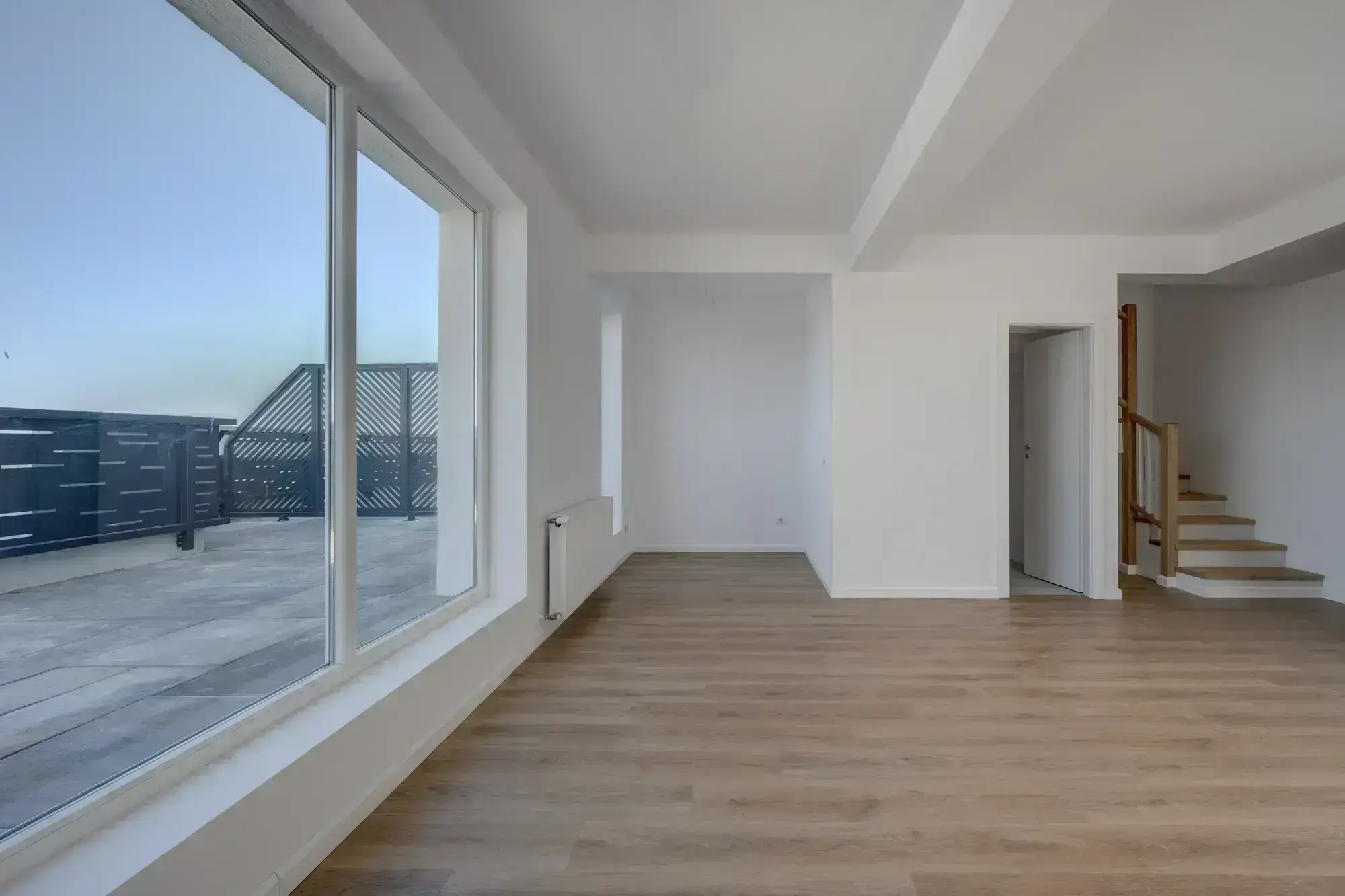 Duplexul este compus la primul palier, dintr-un living spatios cu bucatarie deschisa, o baie si o terasa generoasa.La palierul superior se afla doua dormitoare si o baie ce le deserveste.